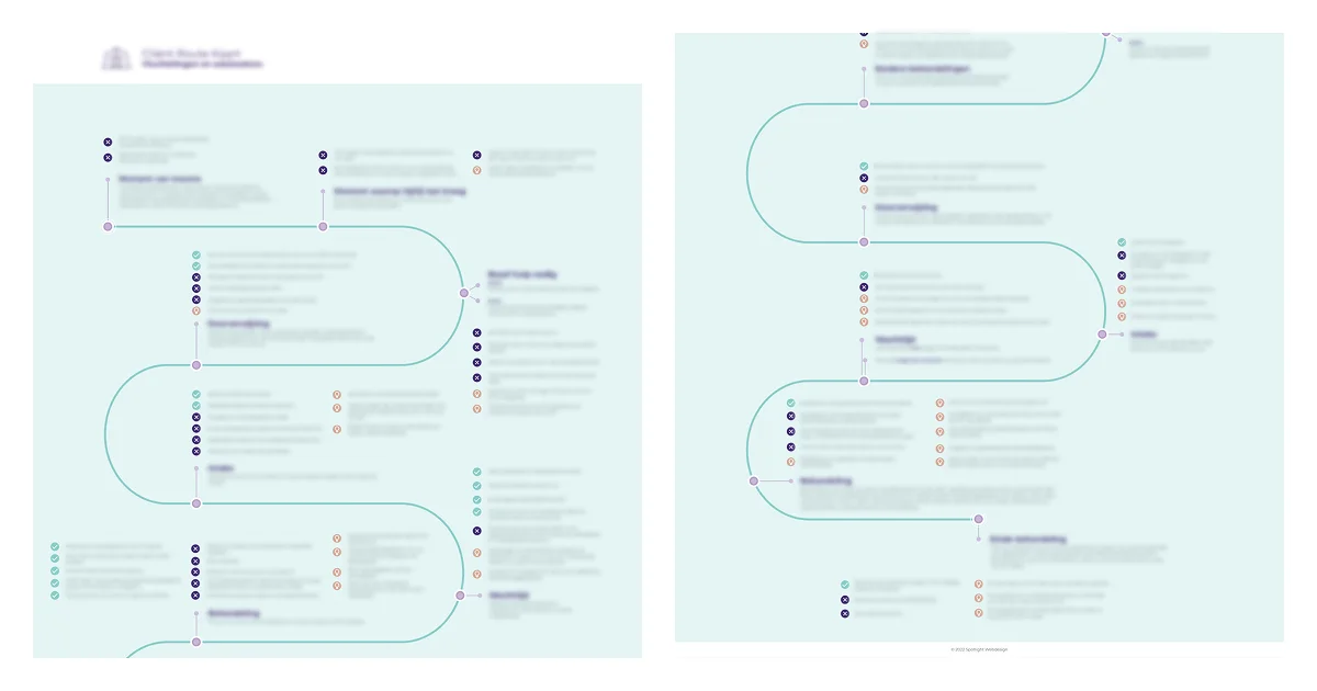 Als onderdeel van het innovatieteam werkten we samen met mensen uit de organisatie. De basis was kwalitatief onderzoek: gesprekken met cliënten, zodat niet alleen het proces, maar vooral ook de beleving inzichtelijk werd. Op basis daarvan zijn customer journey maps gemaakt die de volledige route zichtbaar maken: van eerste contact tot nazorg. Per fase is in kaart gebracht wat er gebeurt, wat cliënten ervaren, waar drempels en onzekerheden zitten en welke momenten cruciaal zijn voor vertrouwen en regie.